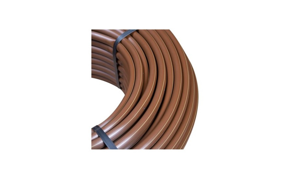 Profesionalna smeđa cijev za navodnjavanje promjera 16 mm s integriranim kapaljkama, idealna za živice, grmlje i cvjetnjake. Zahvaljujući dizajnu s kompenzacijom pritiska, osigurava 90% ujednačenosti protoka bez obzira na pad tlaka ili nagib terena.